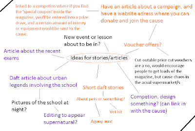 Finished off the rough draft I had already on Monday, and looked through school magazines for research.This is great, as I now know what sort of things I'm going to be advertising as being in the magazine.